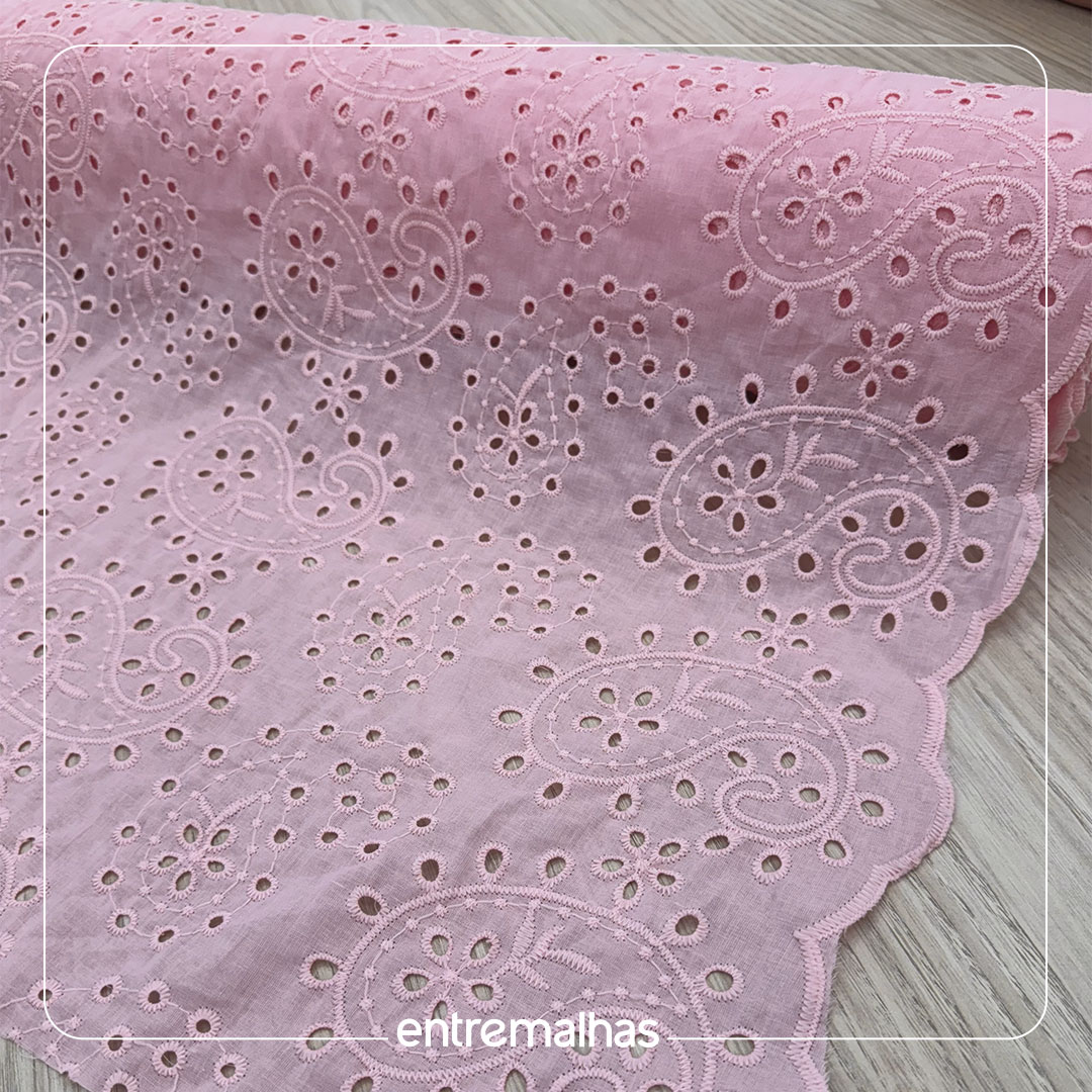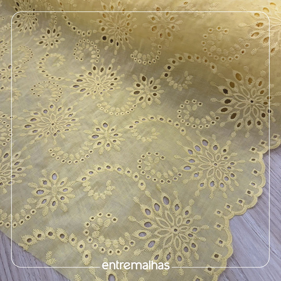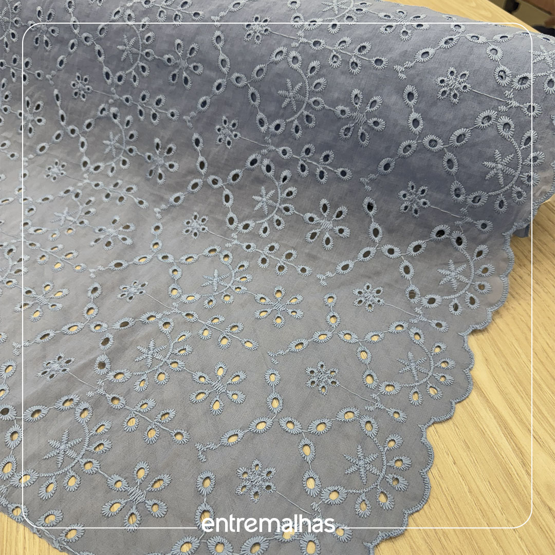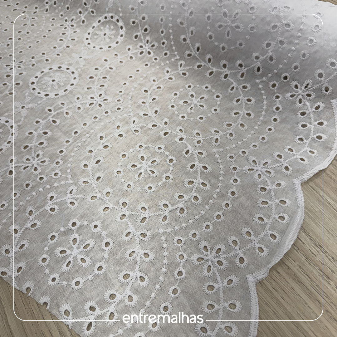 O tecido Brodery Laise bordado é um clássico da moda reconhecido por seus bordados vazados que formam desenhos (geralmente florais ou geométricos) em relevo sobre uma base leve. Possui um toque romântico, delicado e artesanal (handmade), sendo muitas vezes comparado à renda, confortável e com ótimo caimento, ideal para produções frescas e elegantes.