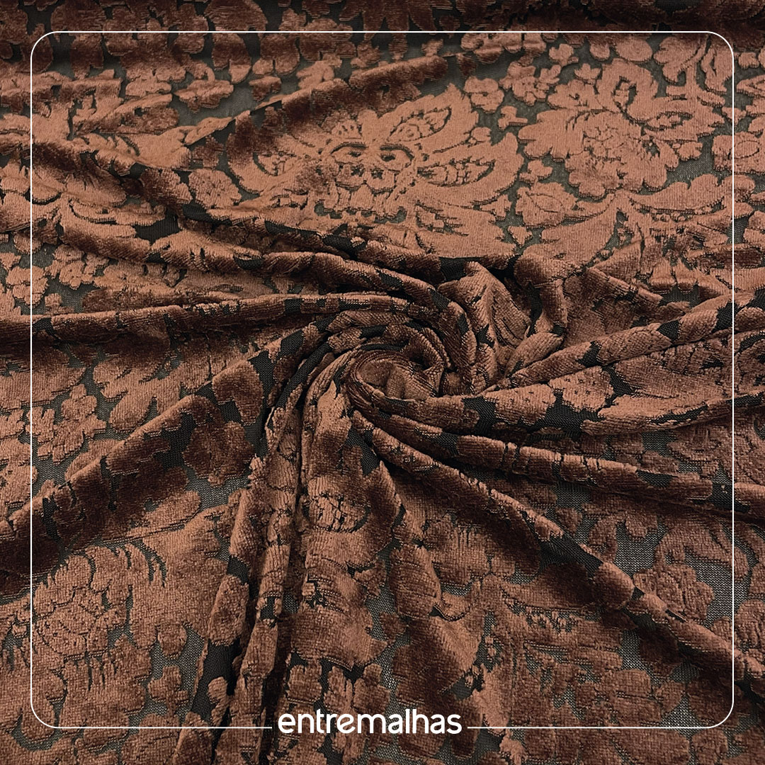 Tecido macio, leve e com aparência sofisticada, caracterizada pelo efeito devore que cria desenhos em transparência sobre a base. Possui toque aveludado, caimento suave e visual elegante, ideal para peças que buscam textura e destaque sem perder o conforto.