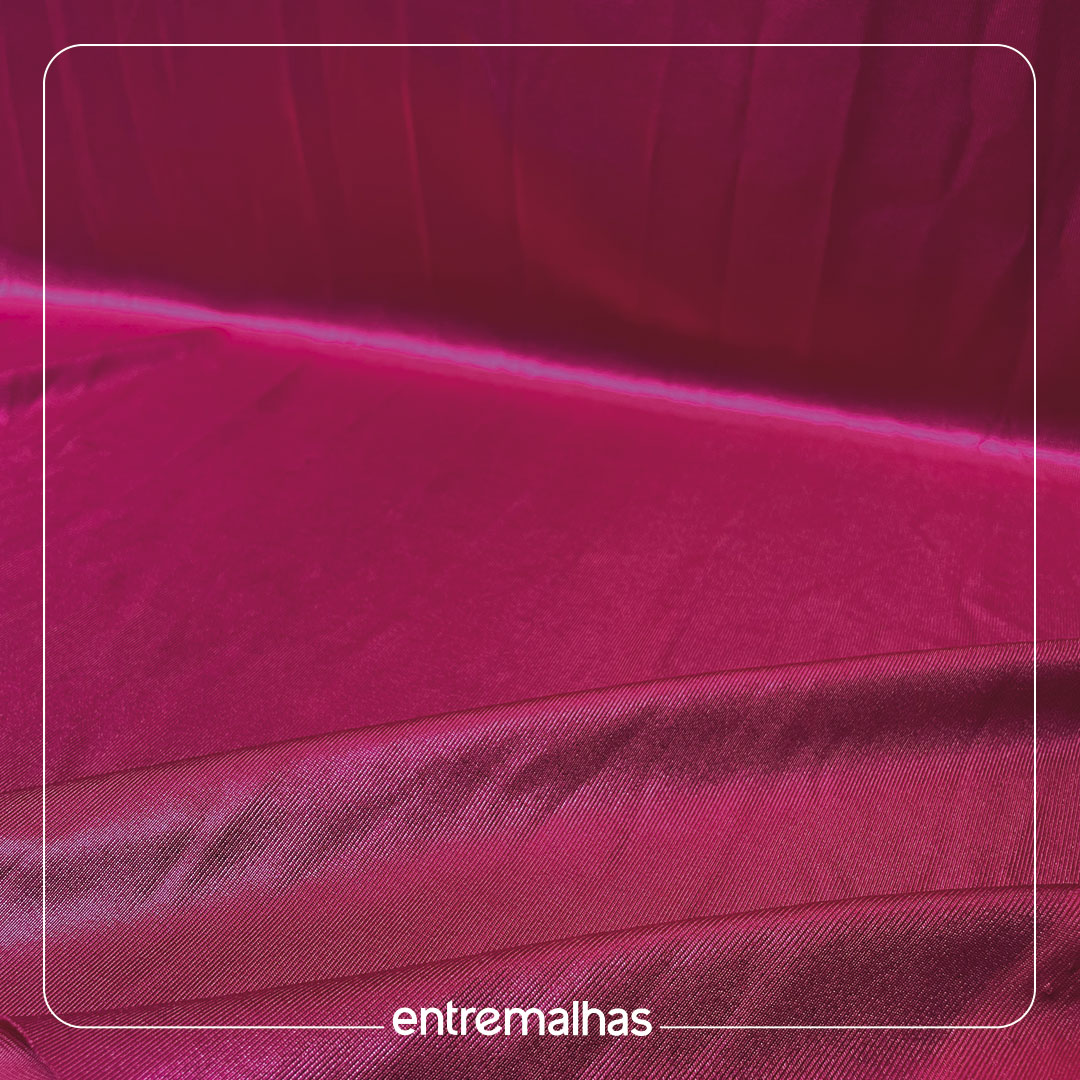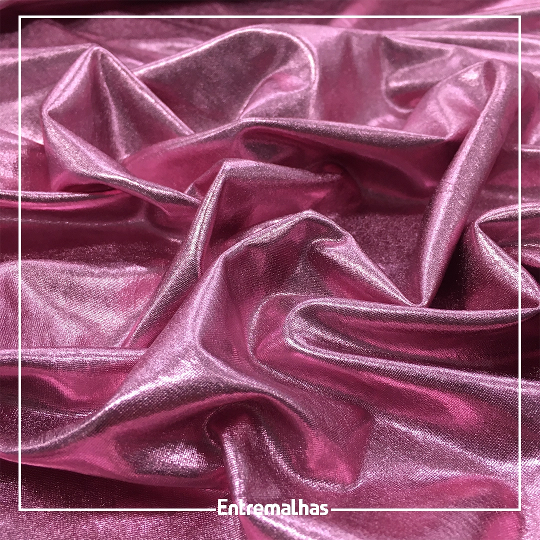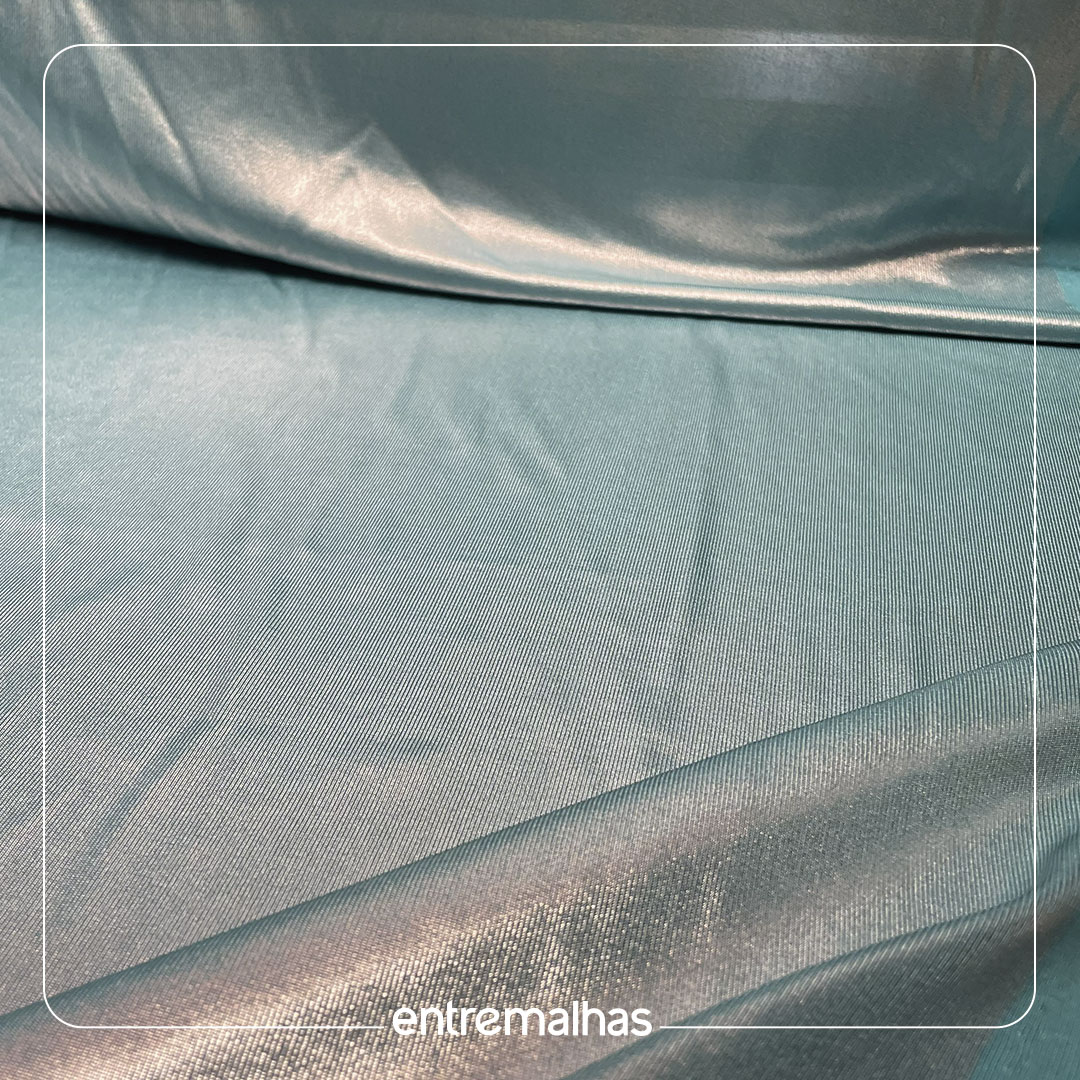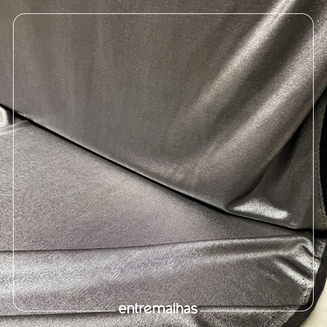 Tecido com acabamento brilhoso de efeito laminado, superfície lisa e toque macio, Tem boa elasticidade, caimento fluido e maleabilidade, facilitando a modelagem de peças ajustadas ou com movimento.