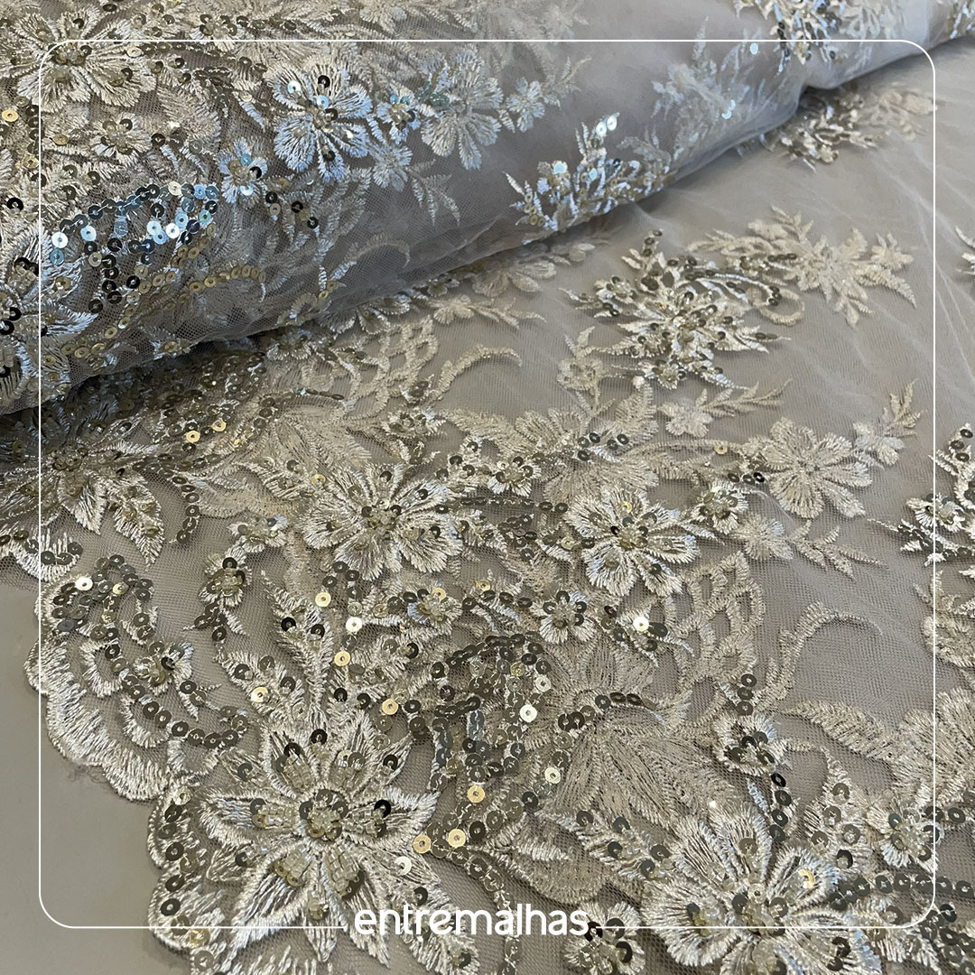 Renda de noiva com bordado em alto relevo, rica em detalhes e com acabamento delicado. Possui toque suave, excelente caimento e visual refinado, ideal para vestidos de noiva, saias amplas, mangas, véus e aplicações estratégicas. Perfeita para quem busca elegância, romantismo e um acabamento de alto padrão na confecção.