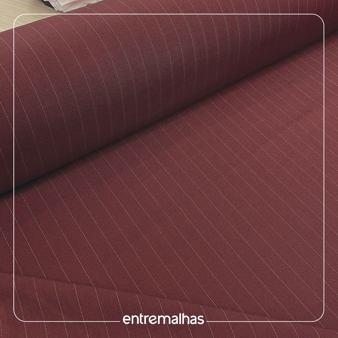 Tecido com base lisa e toque macio, apresentando padronagem clássica de risca de giz em linhas finas e regulares. Possui estrutura com leve elasticidade e ótimo caimento, valorizando modelagens de alfaiataria com conforto e ajuste ao corpo, sendo indicado para blazers, calças, saias, vestidos e conjuntos com proposta moderna e refinada.
